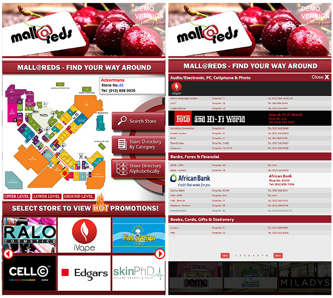 An interactivev wayfinder helps a person find their way around the mall giving them their position in the mall and directions to a particular store.